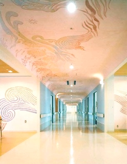 また病院の治療方針によりインテリアデザインには老人の感性に刺激を与えることを目的としたアート作品が採用されている。